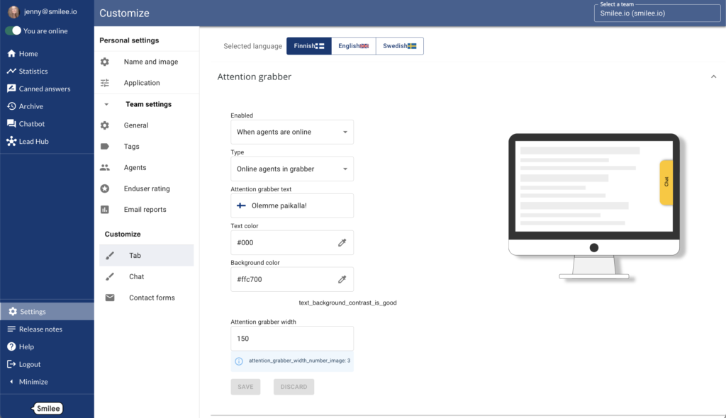 Painikkeen päälle saat myös erillisen huomioelementin. Sen käyttö voi jopa kaksinkertaistaa chattien määrän. Huomioelementin voit lisätä painikkeen päälle sovelluksen Settings/Team settings/Tab -kohdasta (Attention Grabber).